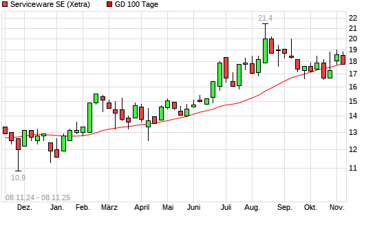 Mit dem Anstieg auf 17,90 EUR hat die Serviceware-Aktie am 07.11.2025 die 100-Tage-Linie nach oben gekreuzt.