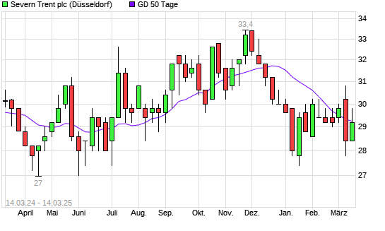 Mit dem Rücksetzer auf 29,00 EUR hat die Severn Trent-Aktie am 13.03.2025 die 50-Tage-Linie nach unten gekreuzt.