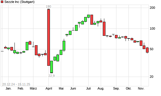 Mit dem Rücksetzer auf 43,70 EUR hat die Sezzle-Aktie (ISIN US78435P1057) am 14.11.2025 ein neues 6-Monats-Tief erreicht und damit den Kurs vom 13.11.2025 eingestellt.