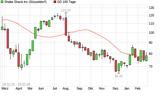 Mit dem Anstieg auf 77,00 EUR hat die Shake Shack A-Aktie am 18.02.2026 die 100-Tage-Linie nach oben gekreuzt.