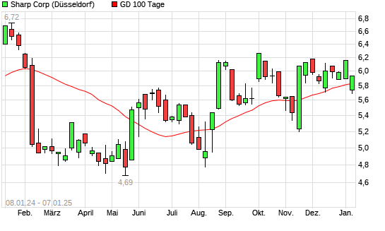 Mit dem Rücksetzer auf 5,63 EUR hat die Sharp-Aktie am 06.01.2025 die 100-Tage-Linie nach unten gekreuzt.