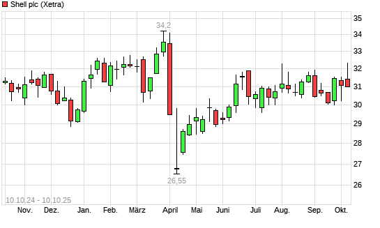 Mit dem Anstieg auf 32,32 EUR hat die Shell (ex Royal Dutch Shell) A-Aktie (ISIN GB00BP6MXD84) am 09.10.2025 ein neues 6-Monats-Hoch erreicht und damit den Kurs vom 19.06.2025 eingestellt.