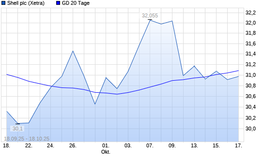Mit dem Anstieg auf 31,23 EUR hat die Shell (ex Royal Dutch Shell) A-Aktie am 17.10.2025 die 20-Tage-Linie nach oben gekreuzt.