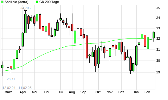Mit dem Rücksetzer auf 31,74 EUR hat die Shell (ex Royal Dutch Shell) A-Aktie am 10.02.2025 die 200-Tage-Linie nach unten gekreuzt.