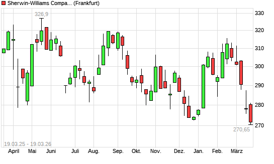 Mit dem Rücksetzer auf 270,65 EUR hat die Sherwin-Williams-Aktie (ISIN US8243481061) am 18.03.2026 ein neues 12-Monats-Tief erreicht und damit den Kurs vom 19.12.2025 eingestellt.