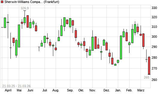 Mit dem Rücksetzer auf 265,00 EUR hat die Sherwin-Williams-Aktie (ISIN US8243481061) am 20.03.2026 ein neues 12-Monats-Tief erreicht und damit den Kurs vom 19.03.2026 eingestellt.