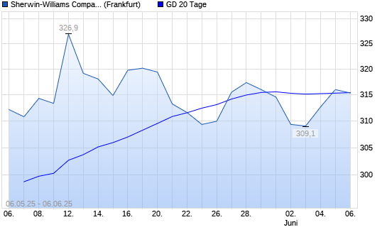 Mit dem Anstieg auf 316,05 EUR hat die Sherwin-Williams-Aktie am 05.06.2025 die 20-Tage-Linie nach oben gekreuzt.