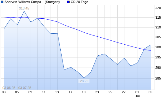 Mit dem Anstieg auf 300,25 EUR hat die Sherwin-Williams-Aktie am 02.07.2025 die 20-Tage-Linie nach oben gekreuzt.
