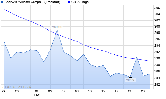 Mit dem Rücksetzer auf 284,60 EUR hat die Sherwin-Williams-Aktie am 23.10.2025 die 20-Tage-Linie nach unten gekreuzt.