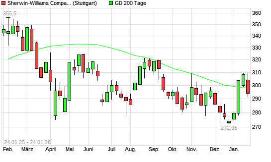 Mit dem Rücksetzer auf 295,80 EUR hat die Sherwin-Williams-Aktie am 23.01.2026 die 200-Tage-Linie nach unten gekreuzt.Die Sherwin-Williams-Aktie befand sich seit dem 09.01.2026 ...weiterlesen