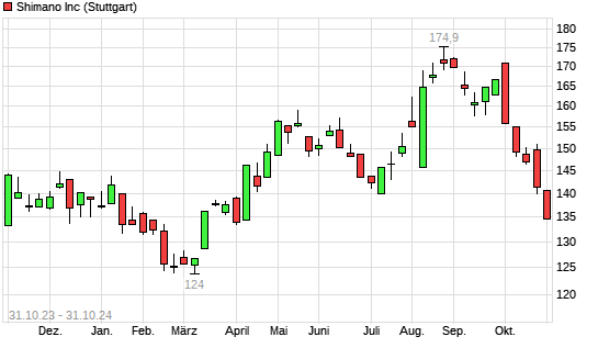 Mit dem Rücksetzer auf 133,50 EUR hat die Shimano-Aktie (ISIN JP3358000002) am 30.10.2024 ein neues 6-Monats-Tief erreicht und damit den Kurs vom 29.10.2024 eingestellt.