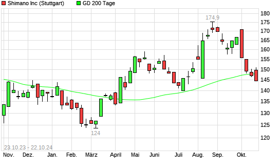 Mit dem Anstieg auf 150,90 EUR hat die Shimano-Aktie am 21.10.2024 die 200-Tage-Linie nach oben gekreuzt.