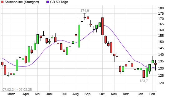 Mit dem Anstieg auf 131,60 EUR hat die Shimano-Aktie am 06.02.2025 die 50-Tage-Linie nach oben gekreuzt.