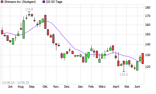 Mit dem Rücksetzer auf 123,10 EUR hat die Shimano-Aktie am 13.06.2025 die 50-Tage-Linie nach unten gekreuzt.
