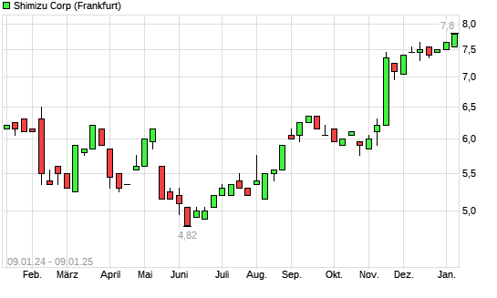Mit dem Anstieg auf 7,75 EUR hat die Shimizu-Aktie (ISIN JP3358800005) am 08.01.2025 ein neues 3-Jahres-Hoch erreicht und damit den Kurs vom 12.12.2024 eingestellt.