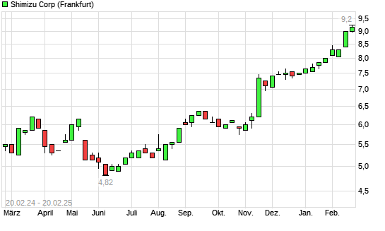 Mit dem Anstieg auf 9,20 EUR hat die Shimizu-Aktie (ISIN JP3358800005) am 19.02.2025 ein neues 5-Jahres-Hoch erreicht und damit den Kurs vom 18.02.2025 eingestellt.