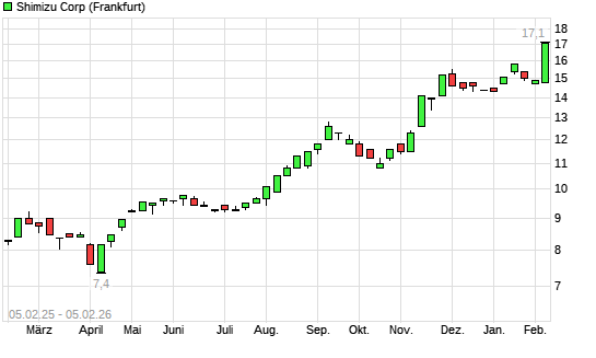 Mit dem Anstieg auf 15,90 EUR hat die Shimizu-Aktie (ISIN JP3358800005) am 04.02.2026 ein neues All-Time-High erreicht und damit den Kurs vom 16.01.2026 eingestellt.