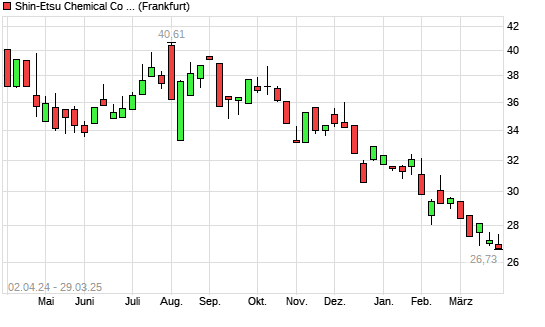 Mit dem Rücksetzer auf 26,73 EUR hat die Shin-Etsu Chemical-Aktie (ISIN JP3371200001) am 28.03.2025 ein neues 12-Monats-Tief erreicht und damit den Kurs vom 11.03.2025 eingestellt.
