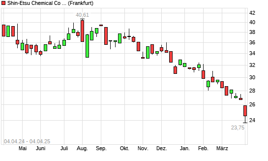 Mit dem Rücksetzer auf 25,08 EUR hat die Shin-Etsu Chemical-Aktie (ISIN JP3371200001) am 03.04.2025 ein neues 12-Monats-Tief erreicht und damit den Kurs vom 02.04.2025 eingestellt.