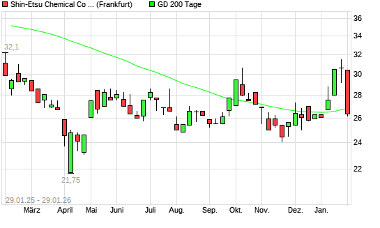 Mit dem Rücksetzer auf 26,18 EUR hat die Shin-Etsu Chemical-Aktie am 28.01.2026 die 200-Tage-Linie nach unten gekreuzt.