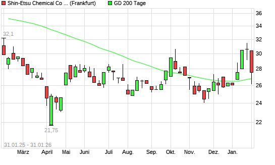 Mit dem Anstieg auf 27,55 EUR hat die Shin-Etsu Chemical-Aktie am 30.01.2026 die 200-Tage-Linie nach oben gekreuzt.Die Shin-Etsu Chemical-Aktie befand sich seit dem 28.01.2026 ...weiterlesen