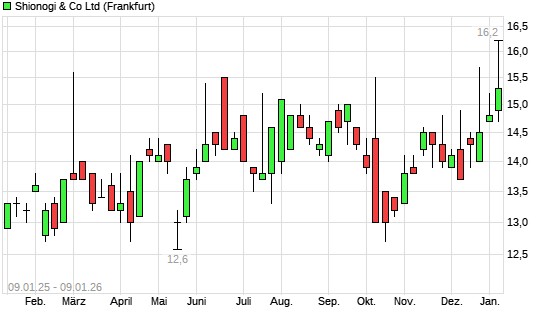 Mit dem Anstieg auf 15,50 EUR hat die Shionogi & Co-Aktie (ISIN JP3347200002) am 08.01.2026 ein neues 12-Monats-Hoch erreicht und damit den Kurs vom 01.08.2025 eingestellt.