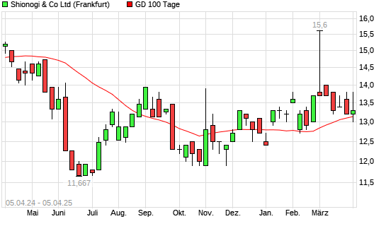 Mit dem Anstieg auf 13,30 EUR hat die Shionogi & Co-Aktie am 04.04.2025 die 100-Tage-Linie nach oben gekreuzt.