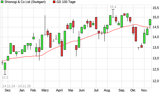 Mit dem Anstieg auf 14,20 EUR hat die Shionogi & Co-Aktie am 13.11.2025 die 100-Tage-Linie nach oben gekreuzt.