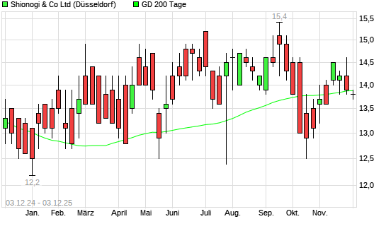 Mit dem Anstieg auf 14,00 EUR hat die Shionogi & Co-Aktie am 02.12.2025 die 200-Tage-Linie nach oben gekreuzt.