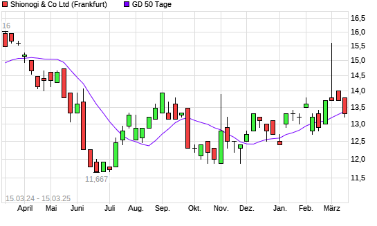 Mit dem Rücksetzer auf 13,30 EUR hat die Shionogi & Co-Aktie am 14.03.2025 die 50-Tage-Linie nach unten gekreuzt.