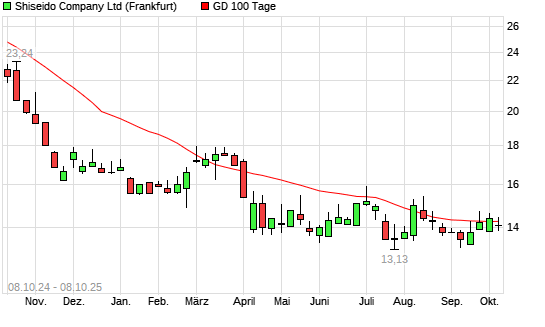Mit dem Rücksetzer auf 13,99 EUR hat die Shiseido-Aktie am 07.10.2025 die 100-Tage-Linie nach unten gekreuzt.
