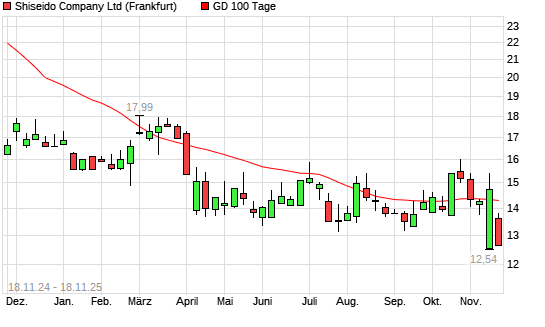 Mit dem Rücksetzer auf 13,60 EUR hat die Shiseido-Aktie am 17.11.2025 die 100-Tage-Linie nach unten gekreuzt.