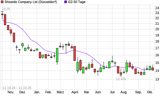 Mit dem Rücksetzer auf 13,95 EUR hat die Shiseido-Aktie am 10.10.2025 die 50-Tage-Linie nach unten gekreuzt.