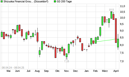 Mit dem Rücksetzer auf 7,80 EUR hat die Shizuoka Bank-Aktie am 07.04.2025 die 200-Tage-Linie nach unten gekreuzt.