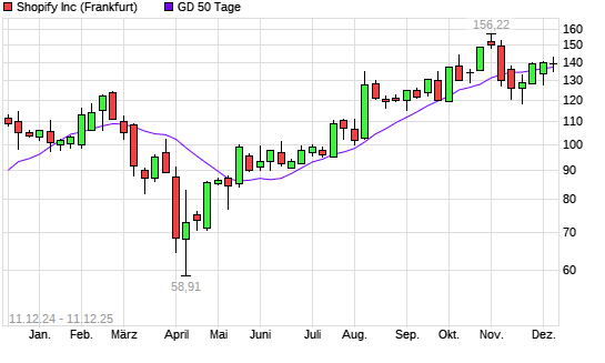 Mit dem Rücksetzer auf 136,44 EUR hat die Shopify-Aktie am 10.12.2025 die 50-Tage-Linie nach unten gekreuzt.