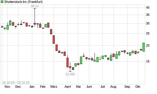Mit dem Anstieg auf 18,89 EUR hat die Shutterstock-Aktie (ISIN US8256901005) am 14.10.2025 ein neues 6-Monats-Hoch erreicht und damit den Kurs vom 06.10.2025 eingestellt.