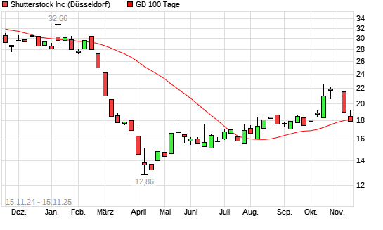 Mit dem Rücksetzer auf 17,62 EUR hat die Shutterstock-Aktie am 14.11.2025 die 100-Tage-Linie nach unten gekreuzt.