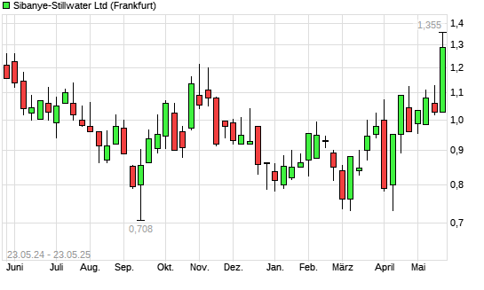Mit dem Anstieg auf 1,28 EUR hat die Sibanye-Stillwater-Aktie (ISIN ZAE000259701) am 22.05.2025 ein neues 12-Monats-Hoch erreicht und damit den Kurs vom 28.05.2024 eingestellt.