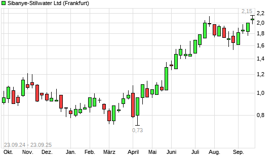 Mit dem Anstieg auf 2,13 EUR hat die Sibanye-Stillwater-Aktie (ISIN ZAE000259701) am 22.09.2025 ein neues 12-Monats-Hoch erreicht und damit den Kurs vom 23.07.2025 eingestellt.