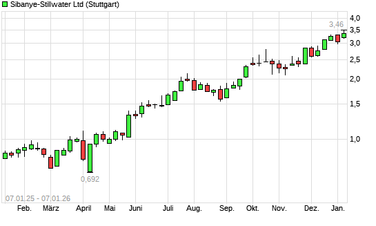 Mit dem Anstieg auf 3,35 EUR hat die Sibanye-Stillwater-Aktie (ISIN ZAE000259701) am 06.01.2026 ein neues 3-Jahres-Hoch erreicht und damit den Kurs vom 05.01.2026 eingestellt.