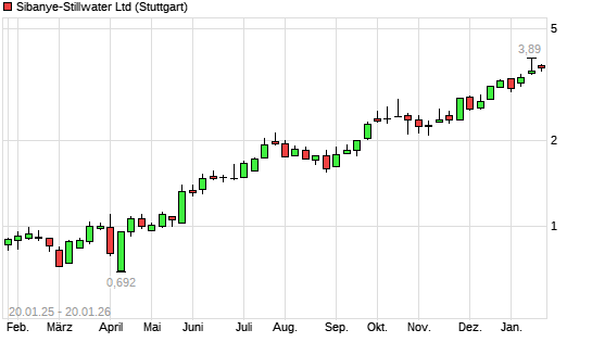 Mit dem Anstieg auf 3,78 EUR hat die Sibanye-Stillwater-Aktie (ISIN ZAE000259701) am 19.01.2026 ein neues 3-Jahres-Hoch erreicht und damit den Kurs vom 15.01.2026 eingestellt.
