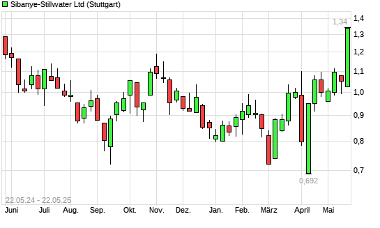 Mit dem Anstieg auf 1,23 EUR hat die Sibanye-Stillwater-Aktie (ISIN ZAE000259701) am 21.05.2025 ein neues 6-Monats-Hoch erreicht und damit den Kurs vom 07.05.2025 eingestellt.