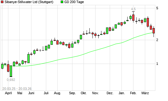 Mit dem Rücksetzer auf 2,38 EUR hat die Sibanye-Stillwater-Aktie am 19.03.2026 die 200-Tage-Linie nach unten gekreuzt.