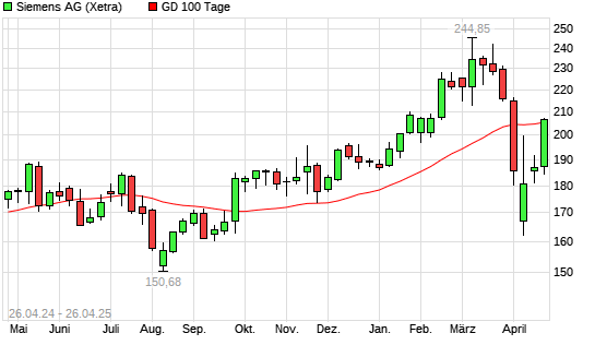 Mit dem Anstieg auf 208,15 EUR hat die Siemens-Aktie am 25.04.2025 die 100-Tage-Linie nach oben gekreuzt.
