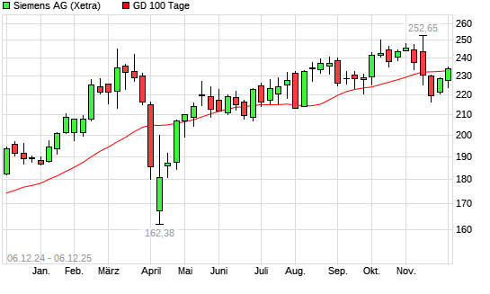 Mit dem Anstieg auf 233,80 EUR hat die Siemens-Aktie am 05.12.2025 die 100-Tage-Linie nach oben gekreuzt.