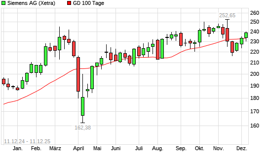Mit dem Rücksetzer auf 231,30 EUR hat die Siemens-Aktie am 10.12.2025 die 100-Tage-Linie nach unten gekreuzt.