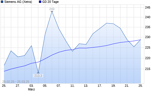 Mit dem Rücksetzer auf 225,00 EUR hat die Siemens-Aktie am 24.03.2025 die 20-Tage-Linie nach unten gekreuzt.