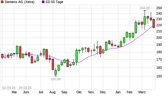 Mit dem Rücksetzer auf 215,00 EUR hat die Siemens-Aktie am 28.03.2025 die 50-Tage-Linie nach unten gekreuzt.