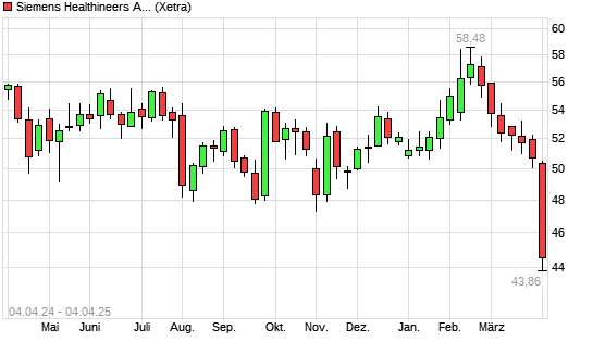 Mit dem Rücksetzer auf 46,61 EUR hat die Siemens Healthineers-Aktie (ISIN DE000SHL1006) am 03.04.2025 ein neues 12-Monats-Tief erreicht und damit den Kurs vom 01.11.2024 eingestellt.