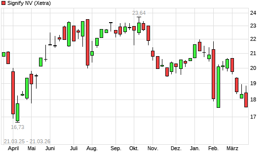 Mit dem Rücksetzer auf 17,85 EUR hat die Signify-Aktie (ISIN NL0011821392) am 20.03.2026 ein neues 6-Monats-Tief erreicht und damit den Kurs vom 02.02.2026 eingestellt.